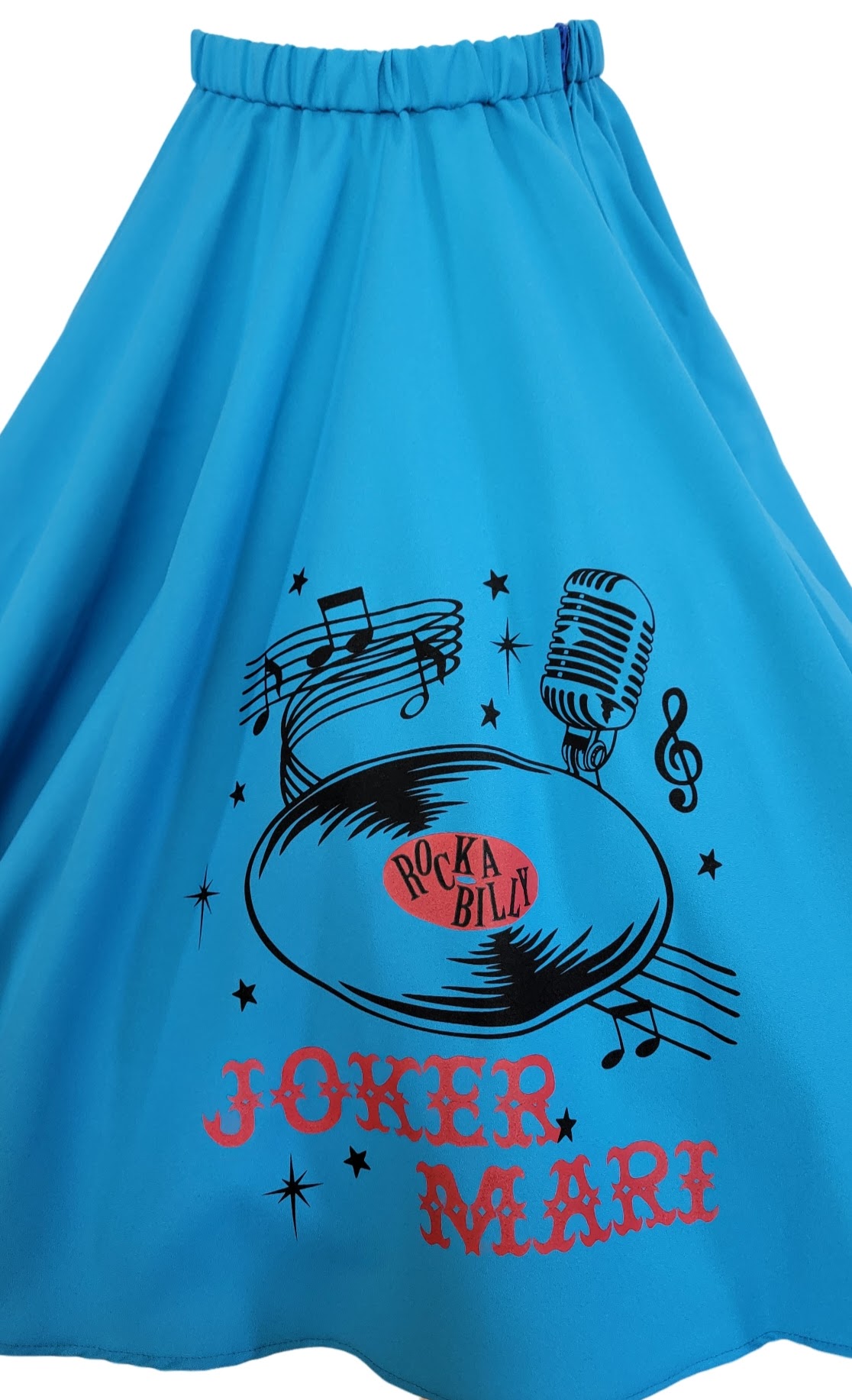 ジョーカーアンドマリ定番のサーキュラースカート。オリジナルプリントは「Rockabilly Record」発色・耐久に優れたシルクプリントになります。